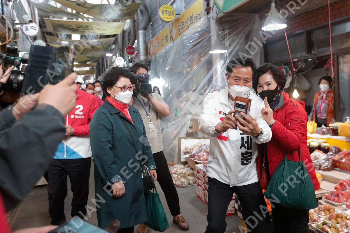 Oh Se-hoon, second from right, the candidate of the main opposition People Power Party, takes photos with his supporter during a campaign for the April 7 Seoul mayoral by-election at a market in Seoul, South Korea, Tuesday, April 6, 2021. (AP Photo/Ahn Young-joon)