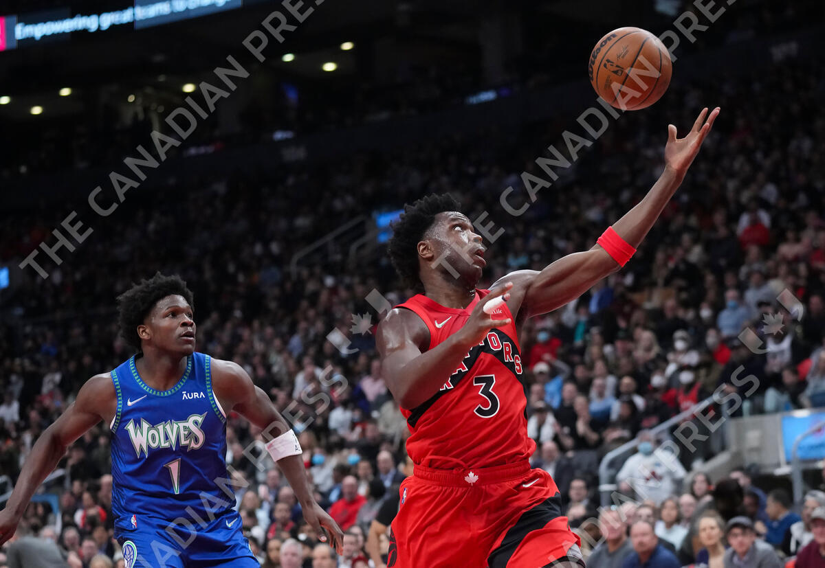 Toronto Raptors forward OG Anunoby (3) drive past Minnesota Timberwolves forward Anthony Edwards (1) during first half NBA basketball action in Toronto, Wednesday, March 30, 2022. THE CANADIAN PRESS/Nathan Denette