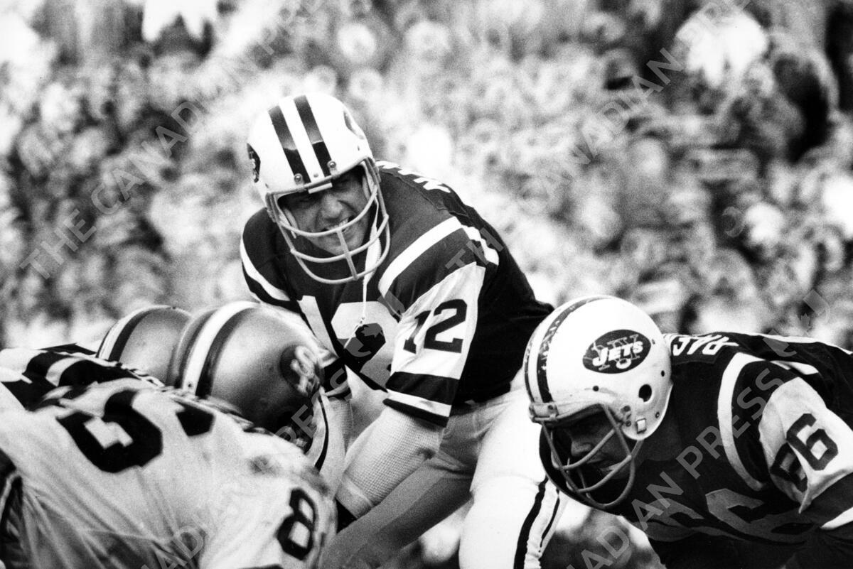 FILE- In this Nov. 28, 1971 file photo, New York Jets quarterback Joe Namath (12) makes a call during second quarter of a football game against the San Francisco 49ers in New York. The conversation about the team's greatest player, let alone quarterback, starts and ends with Namath. Broadway Joe might not have had gaudy career stats, but he's a Hall of Famer who still leads the franchise in several passing categories. (AP Photo/File)
