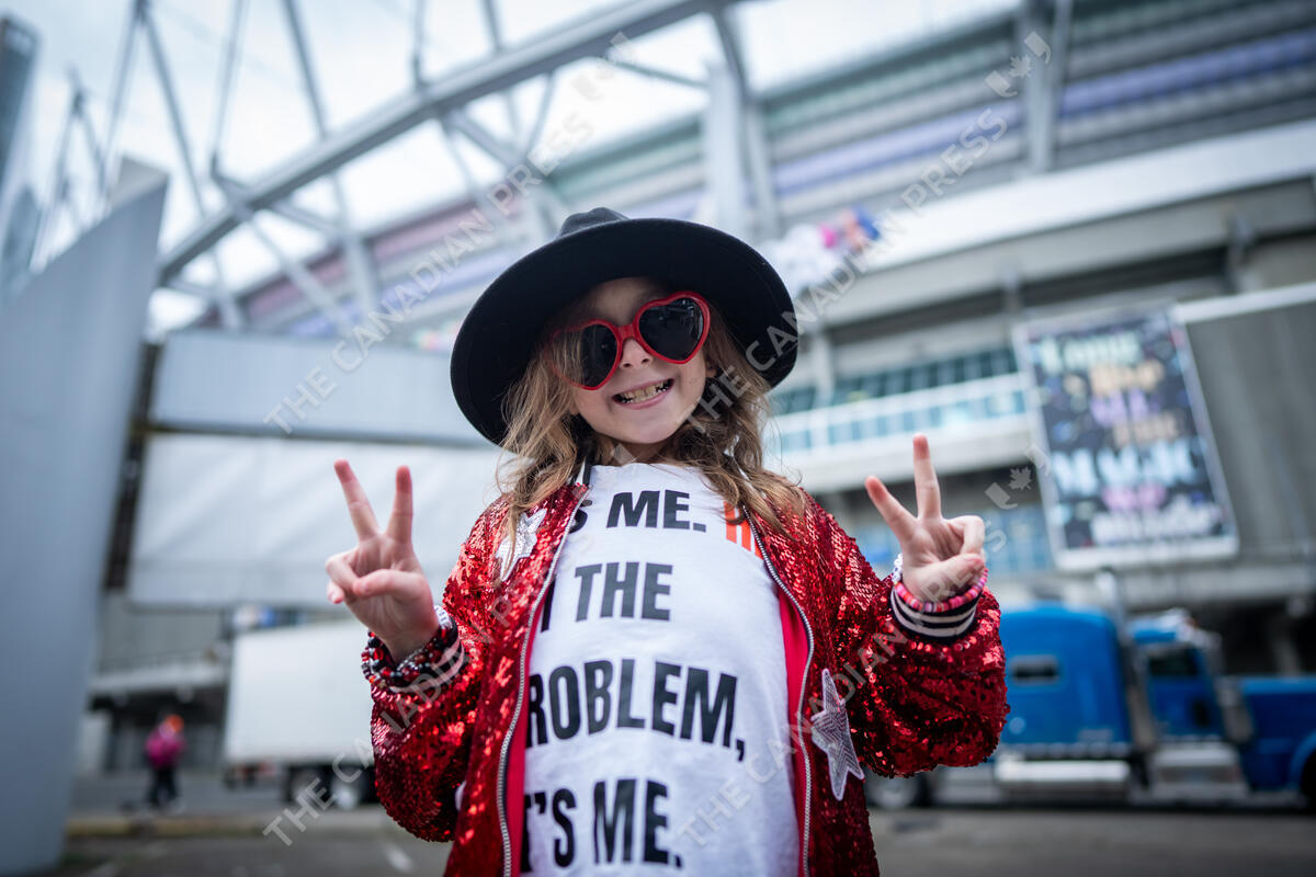 A fan dressed up for the Taylor Swift Eras Tour poses outside of BC Place before the concert stop in Vancouver, on Friday, December 6, 2024. THE CANADIAN PRESS/Ethan Cairns
