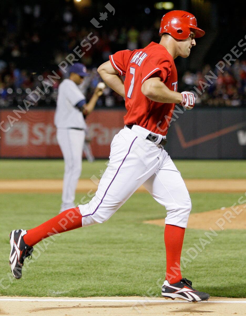 Texas Rangers' David Murphy trots home following his solo home run off of Cleveland Indians' Rafael Perez, rear, in the eighth inning of a baseball game Tuesday, July 6, 2010, in Arlington, Texas. The Rangers won 12-1. (AP Photo/Tony Gutierrez)
