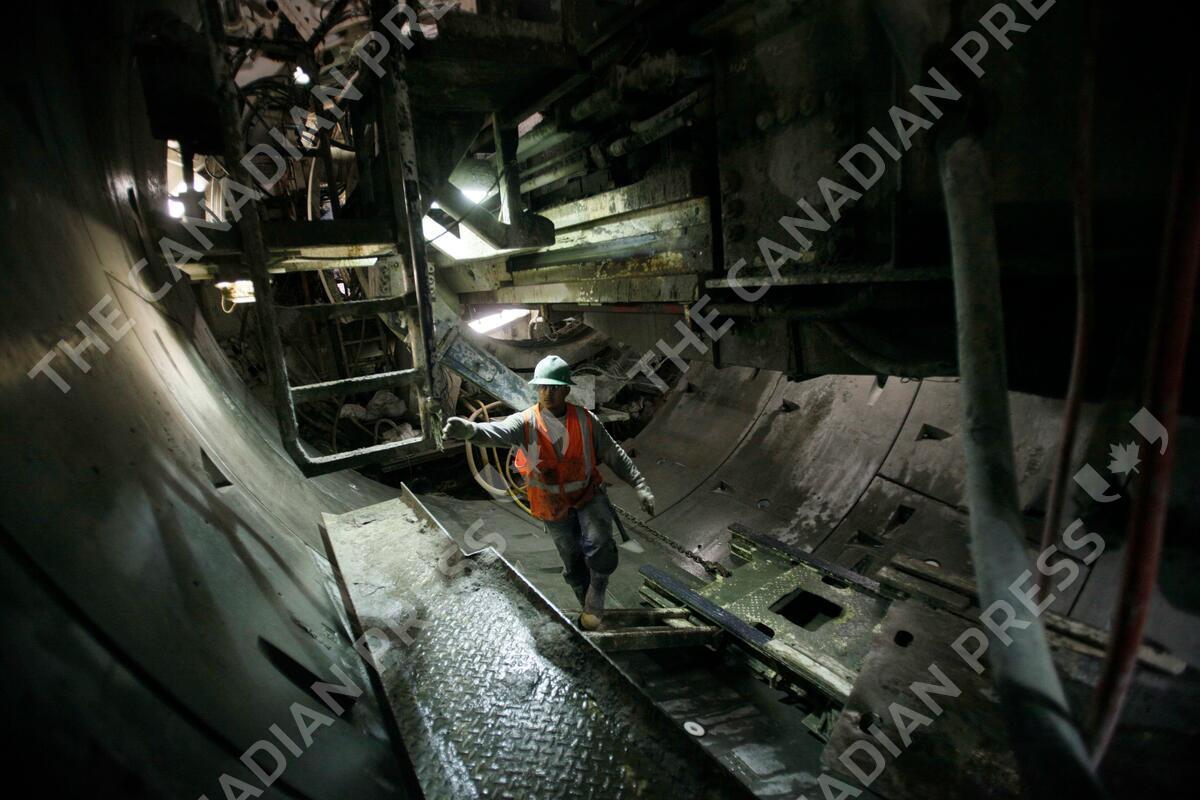 A sand hog works inside the tunnel-boring machine that carves out the massive cavern for the new 34th Street Station that will be part of the Number 7 subway extension at the Hudson Yards in Manhattan, Wednesday, Feb. 3, 2010 in New York. The $2.1 billion project, funded by the city and managed by the MTA, is the first subway expansion in decades. In December, the second of two tunnel-boring machines reached the southern wall of the 34th Street Station cavern after mining a combined 2,900 feet from their starting point at 26th Street under 11th Avenue. The machines are now drilling tunnels north of 34th Street towards 42nd Street. (AP Photo/Mary Altaffer)