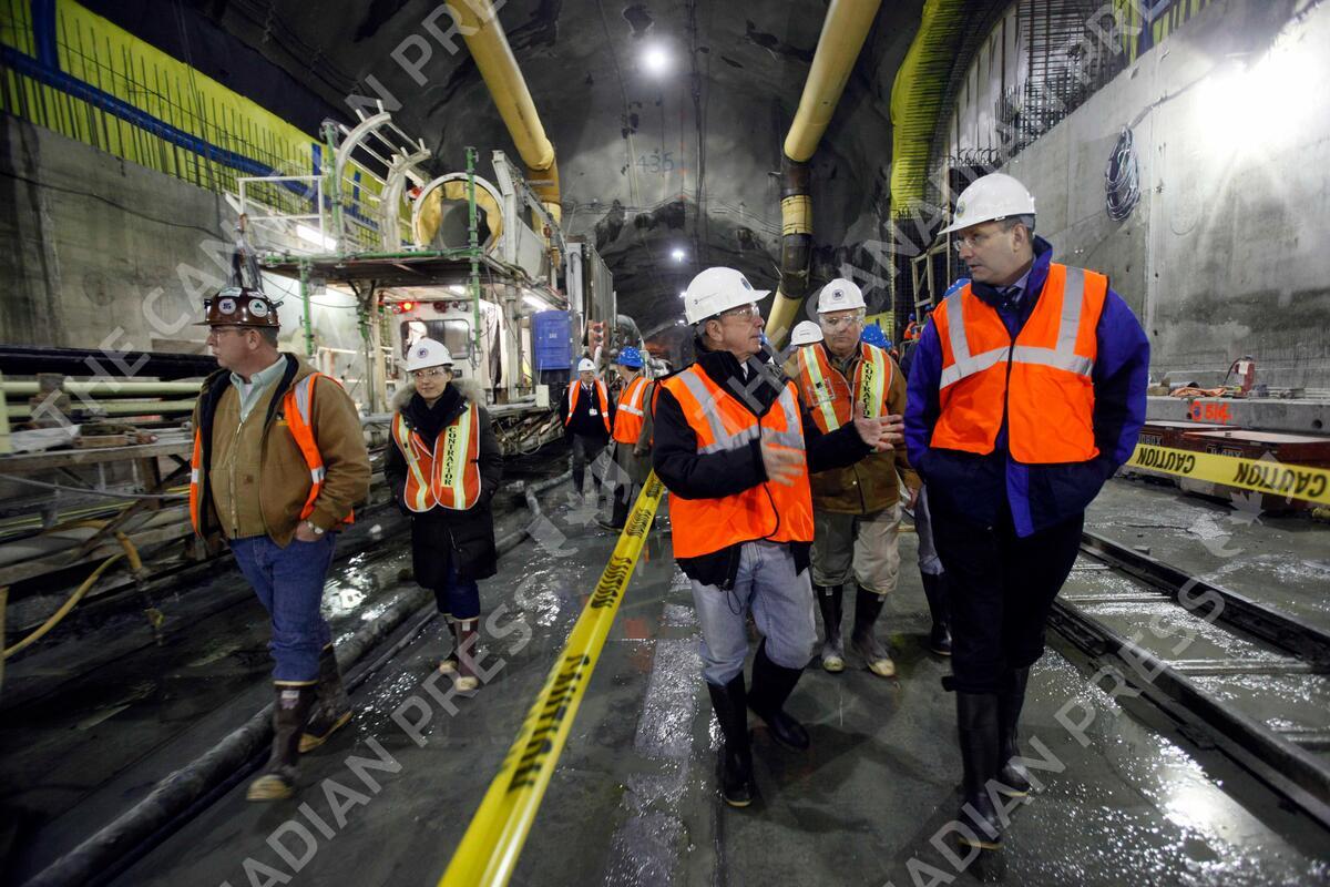 New York City Mayor Michael Bloomberg, center, and MTA Chairman and CEO Jay Walder, right, tour the massive cavern for the new 34th Street Station that will be part of the Number 7 subway extension at the Hudson Yards in Manhattan, Wednesday, Feb. 3, 2010 in New York. The $2.1 billion project, funded by the city and managed by the MTA, is the first subway expansion in decades. In December, the second of two tunnel-boring machines reached the southern wall of the 34th Street Station cavern after mining a combined 2,900 feet from their starting point at 26th Street under 11th Avenue. The machines are now drilling tunnels north of 34th Street towards 42nd Street. (AP Photo/Mary Altaffer)