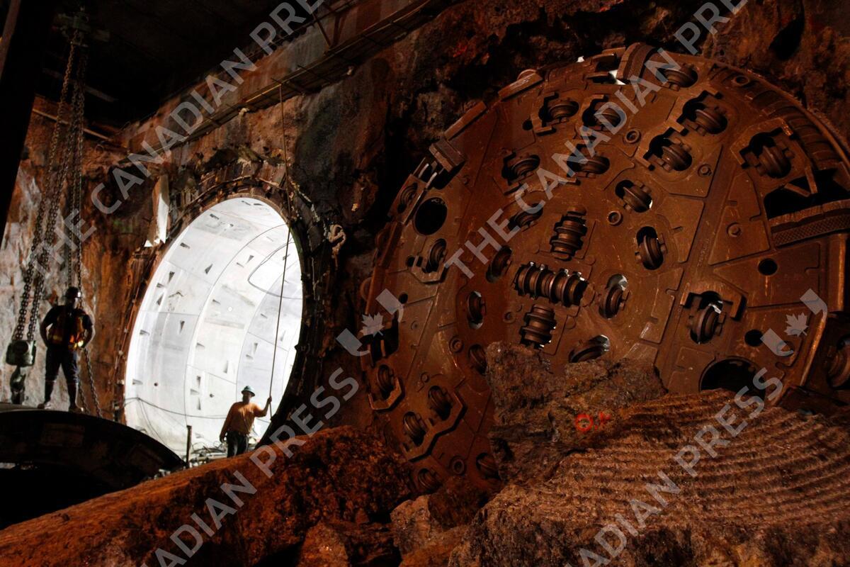 A couple of Sandhogs stand on a tunnel boring machine next to another that just cut through the bedrock underneath the Port Authority bus terminal, Thursday, July 15, 2010 in New York. The tunnel will extend No. 7 subway line to the far west side of New York city. (AP Photo/Mary Altaffer)