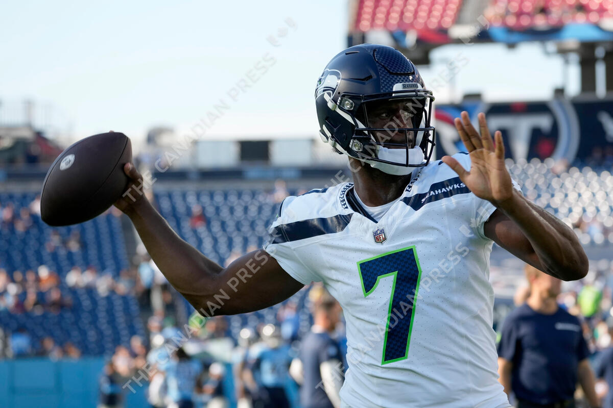 Seattle Seahawks quarterback Geno Smith (7) warms up before an NFL preseason football game against the Tennessee Titans, Saturday, Aug. 17, 2024, in Nashville, Tenn. (AP Photo/George Walker IV)