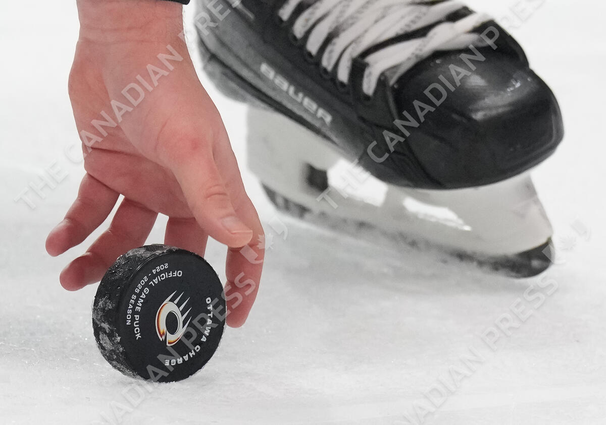 A detailed view as a referee picks up a game puck between the Ottawa Charge and the Minnesota Frost during third period PWHL hockey action in Ottawa, on Thursday, February 13, 2025. THE CANADIAN PRESS/Chris Tanouye