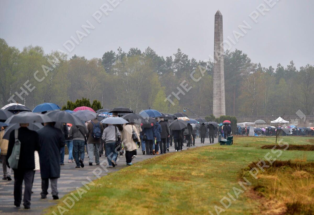 Family members, survivors and other participants walk to a memorial at the former concentration camp during a ceremony to mark the 70th anniversary of the liberation of the Bergen-Belsen concentration camp in Bergen, northern Germany, Sunday, April 26, 2015. More than 52,000 people died in the Nazi terror in Bergen-Belsen, among them the famous teenage diarist Anne Frank, until British troops liberated the camp in April 1945. (AP Photo/Martin Meissner)