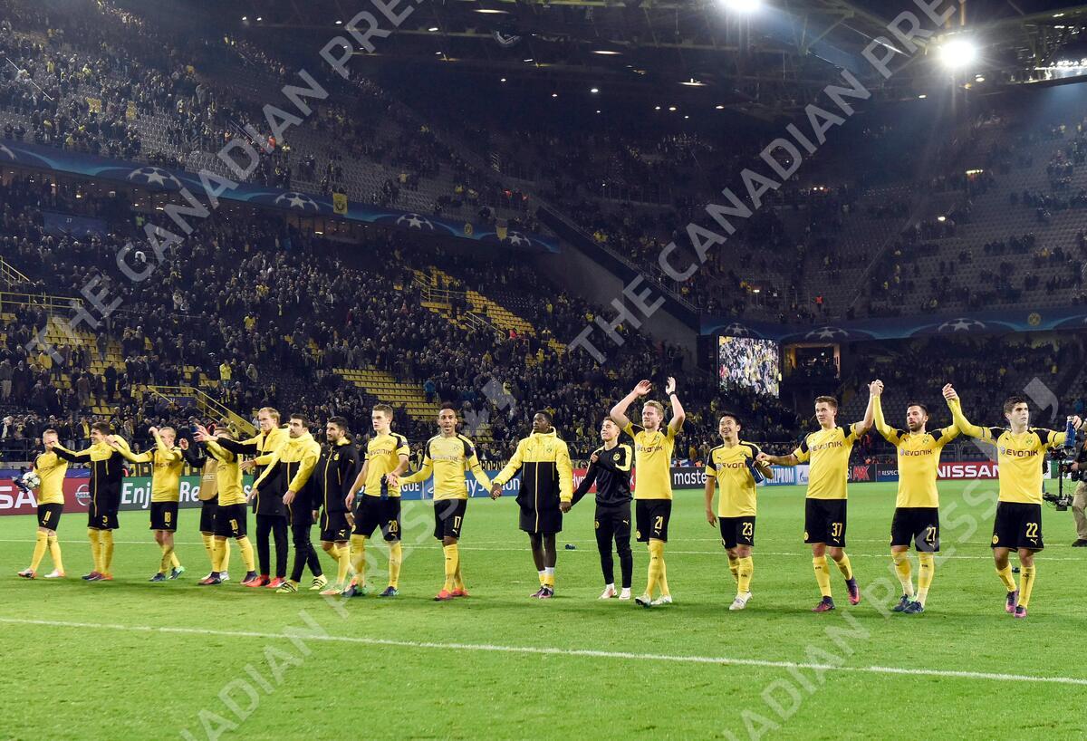 Dortmund's players celebrate after the Champions League Group F soccer match between Borussia Dortmund and Legia Warsaw in Dortmund, Germany, Tuesday, Nov. 22, 2016. Dortmund defeated Legia by 8-4. (AP Photo/Martin Meissner)