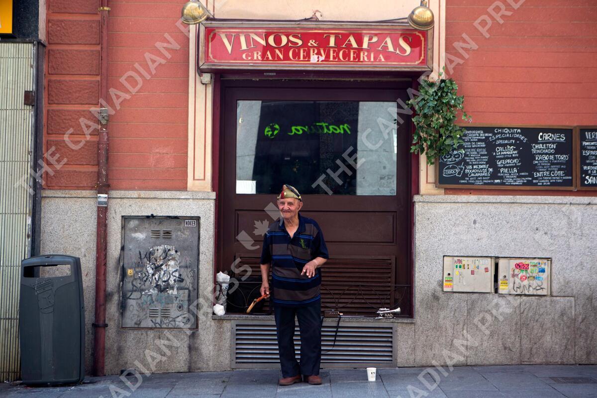 A man dances for money outside a wine, beer and tapas bar in Madrid, Spain, Friday, June 9, 2017. (AP Photo/Paul White)