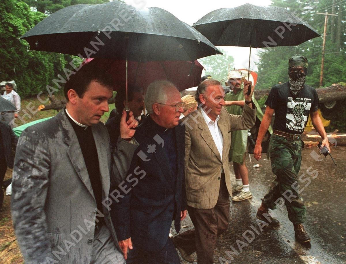 John Ciaccia, Quebec native affairs minister, arrives behind Mohawk barricades with two official observers (left) requested by them on the third day of talks with Native leaders in Kanesatake July 15, 1990. (CP Photo/Ryan Remiorz).
