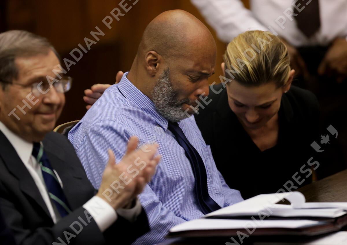 Lamar Johnson, center, and his attorneys react on Tuesday, Feb. 14, 2023, after St. Louis Circuit Judge David Mason vacated his murder conviction during a hearing in St. Louis, Mo. Johnson served nearly 28 years of a life sentence for a killing that he has always said he didn't commit. (Christian Gooden/St. Louis Post-Dispatch via AP, Pool)