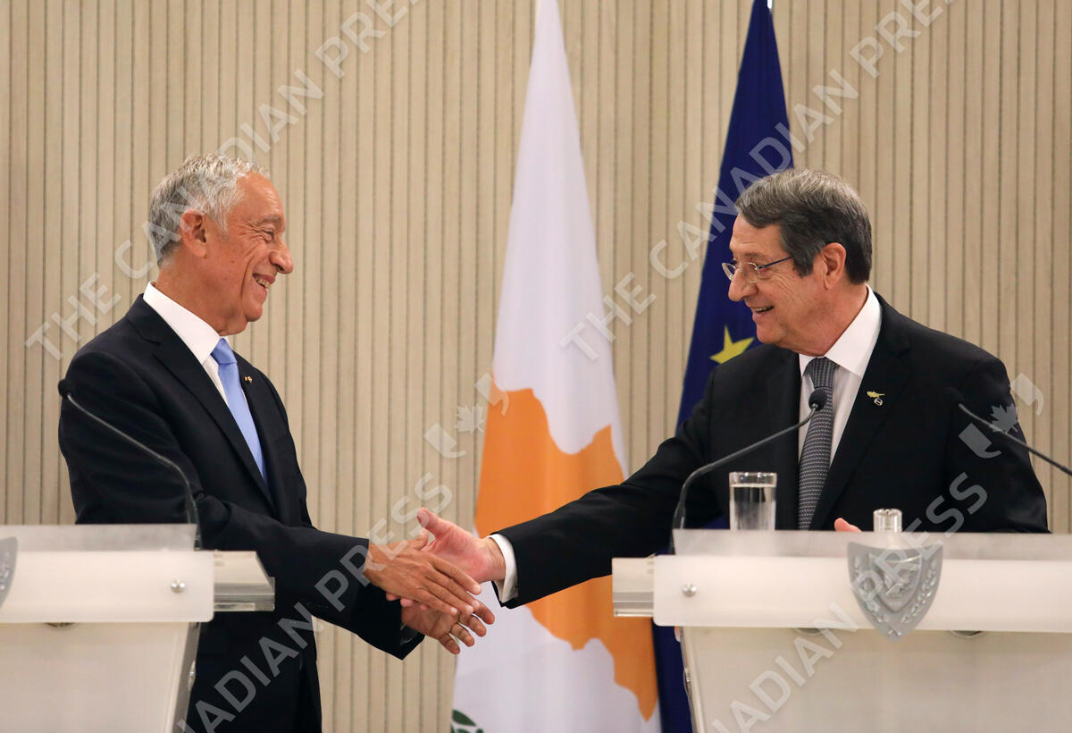 Cyprus President Nicos Anastasiades, right, and Portugal's President Marcelo Rebelo de Sousa shake hands after a press conference and after their meeting at the presidential palace in Nicosia, Cyprus, on Saturday, Oct. 8, 2022. Sousa is in Cyprus for official visit. (Yiannis Kourtoglou Pool via AP)