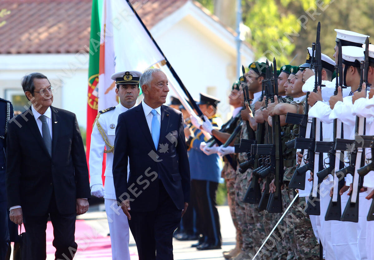 Cyprus President Nicos Anastasiades, left, and Portugal's President Marcelo Rebelo de Sousa review a military guard of honor before their meeting at the presidential palace in Nicosia, Cyprus, on Saturday, Oct. 8, 2022. Sousa is in Cyprus for official visit. (Yiannis Kourtoglou Pool via AP)
