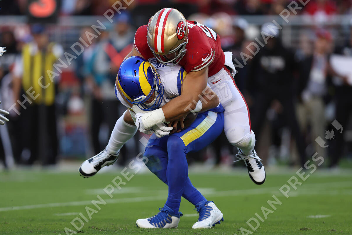 San Francisco 49ers defensive end Nick Bosa, top, sacks Los Angeles Rams quarterback Matthew Stafford during the first half of an NFL football game in Santa Clara, Calif., Monday, Oct. 3, 2022. (AP Photo/Jed Jacobsohn)