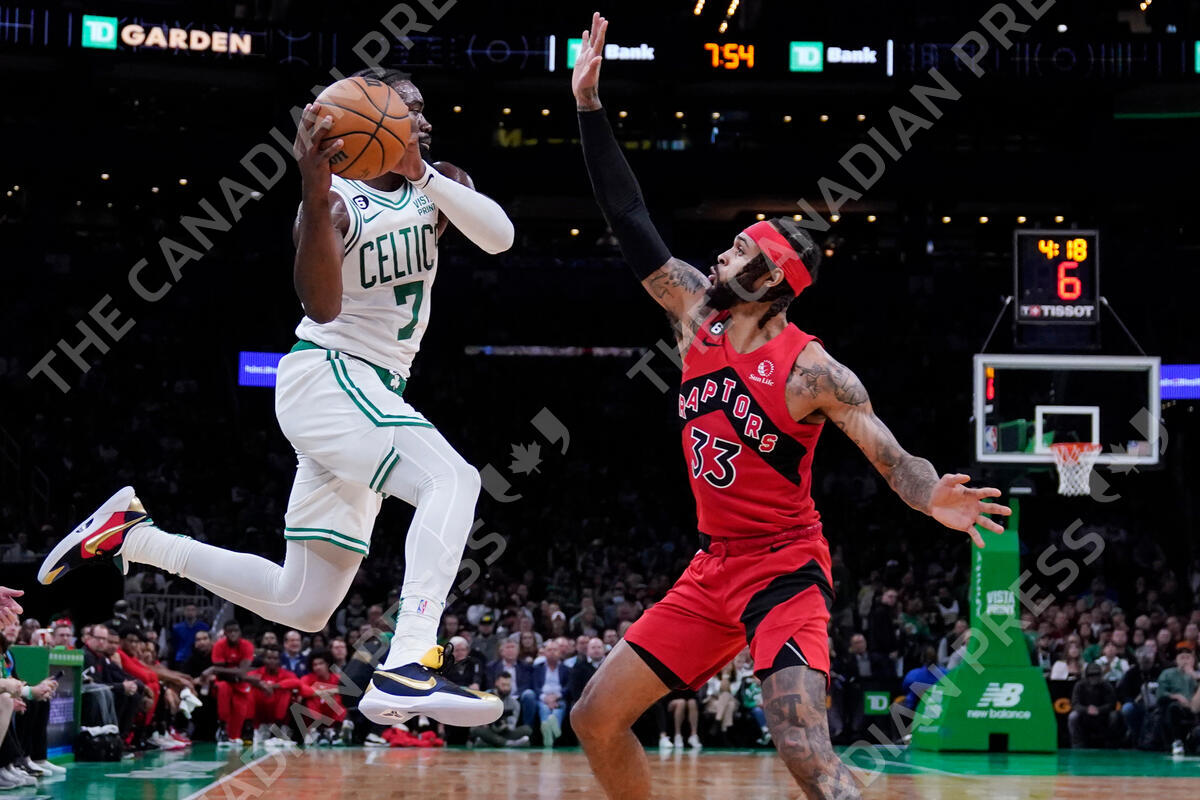 Boston Celtics guard Jaylen Brown (7) looks to pass while pressured by Toronto Raptors guard Gary Trent Jr. (33) during the first half of an NBA preseason basketball game, Wednesday, Oct. 5, 2022, in Boston. (AP Photo/Charles Krupa)