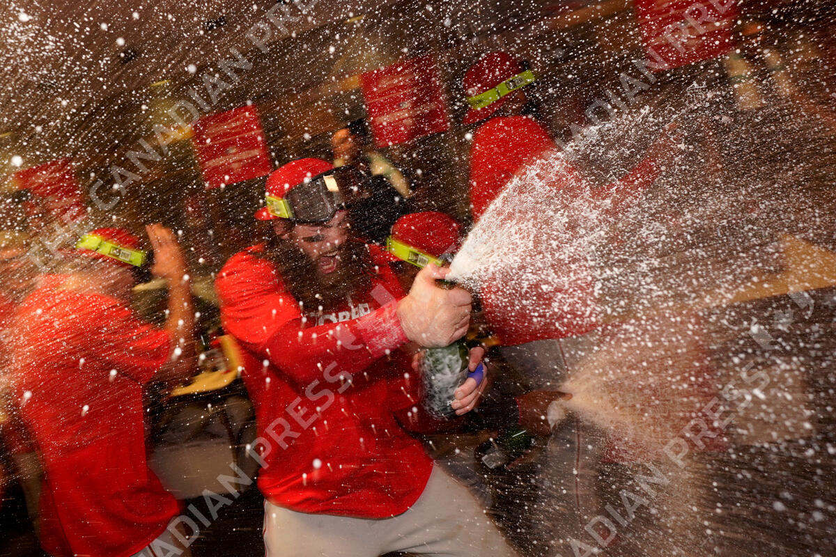 Philadelphia Phillies' Brandon Marsh celebrates after the Phillies won a baseball game against the Houston Astros to clinch a wild-card playoff spot, Monday, Oct. 3, 2022, in Houston. (AP Photo/David J. Phillip)