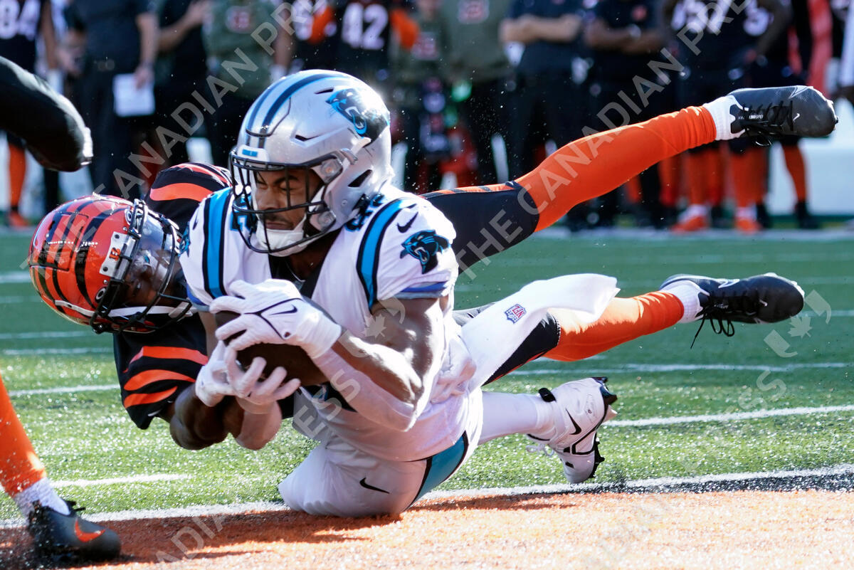 Carolina Panthers tight end Tommy Tremble (82) makes a touchdown catch as Cincinnati Bengals safety Dax Hill (23) defends during the second half of an NFL football game, Sunday, Nov. 6, 2022, in Cincinnati. (AP Photo/Joshua A. Bickel)