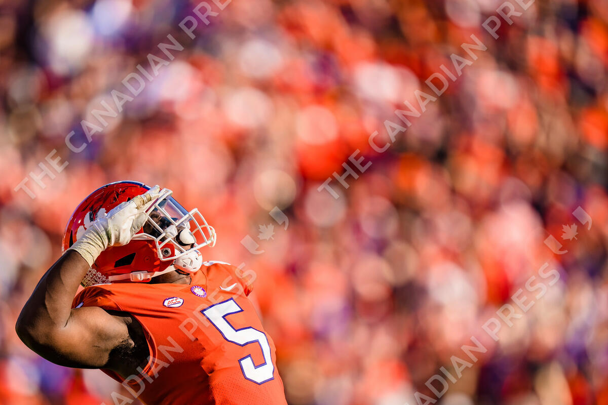Clemson defensive end K.J. Henry salutes after making a sack in the second half of an NCAA college football game against South Carolina on Saturday, Nov. 26, 2022, in Clemson, S.C. (AP Photo/Jacob Kupferman)