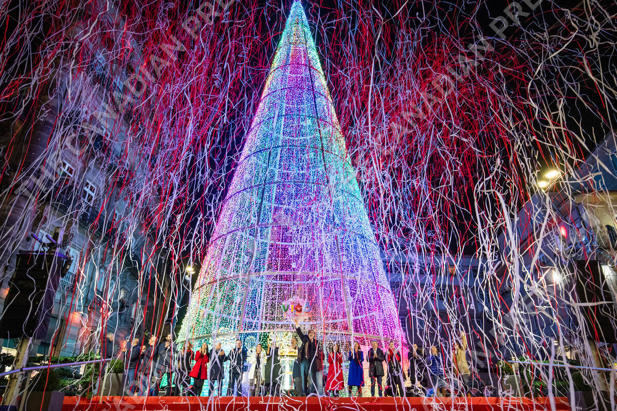 Local authorities inaugurate the Christmas lighting in the streets of Vigo, Spain, Saturday, Nov. 19, 2022. Ahead of other cities, the northwestern port city of Vigo switched on the Christmas light with a lightshow on Saturday Nov. 19, in what has become a significant tourist attraction. (AP Photo/Lalo R. Villar)