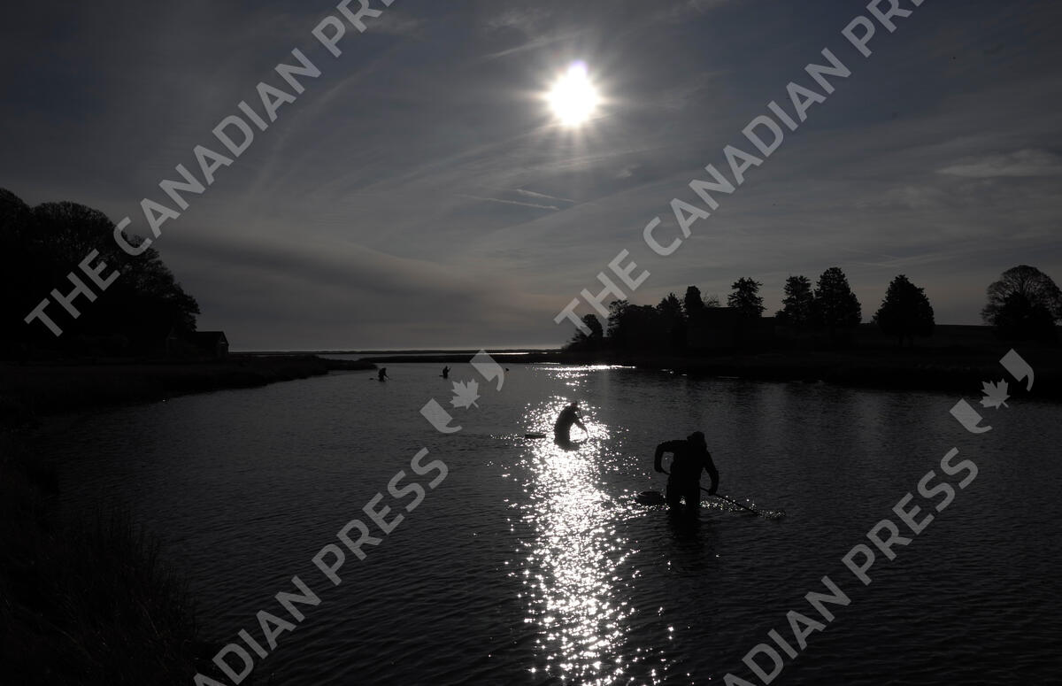 People rake for oysters as the sun rises over Salt Pond Bay in Eastham, Mass., Sunday, Nov. 27, 2022. (AP Photo/Virginia Mayo)