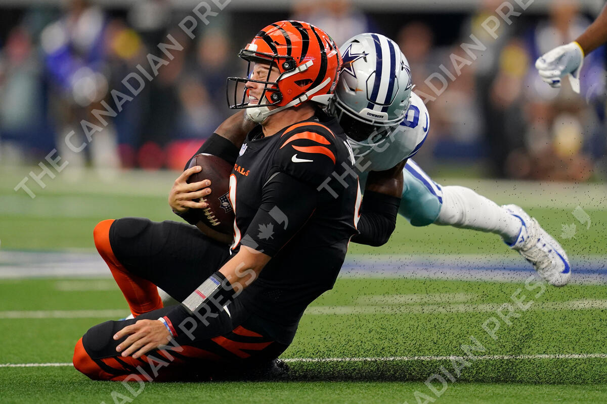 Cincinnati Bengals quarterback Joe Burrow (9) reacts to a late hit by Dallas Cowboys safety Donovan Wilson (6) after a scramble during the first half of an NFL football game Sunday, Sept. 18, 2022, in Arlington, Tx. (AP Photo/Tony Gutierrez)
