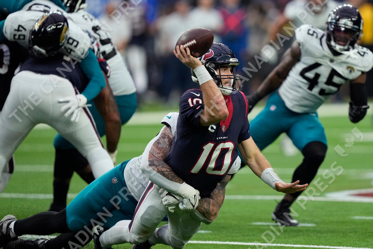 Houston Texans quarterback Davis Mills (10) is hit by Jacksonville Jaguars defensive end Adam Gotsis, left, as he tris to pass during the second half of an NFL football game in Houston, Sunday, Jan. 1, 2023. (AP Photo/David J. Phillip)
