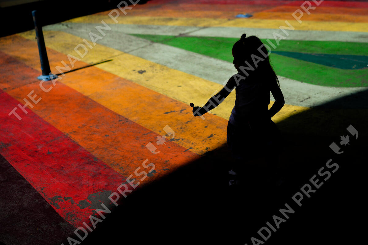 A girl plays as she walks through the Paseo Bandera in Santiago, Chile, Thursday, Jan. 19, 2023. (AP Photo/Matias Delacroix)