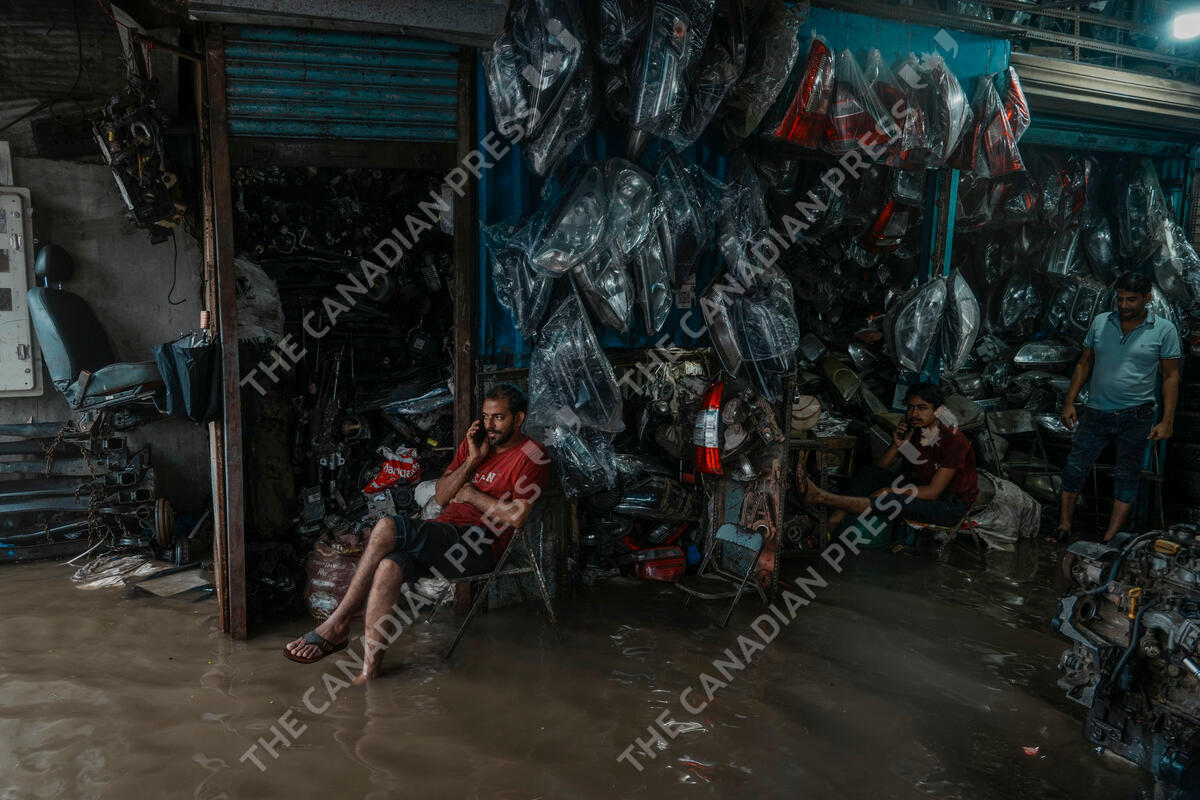 Auto repair shop employees watch water level rise inside their shop during monsoon rains in Mumbai, India, Thursday, July 25, 2024. (AP Photo/Rafiq Maqbool)