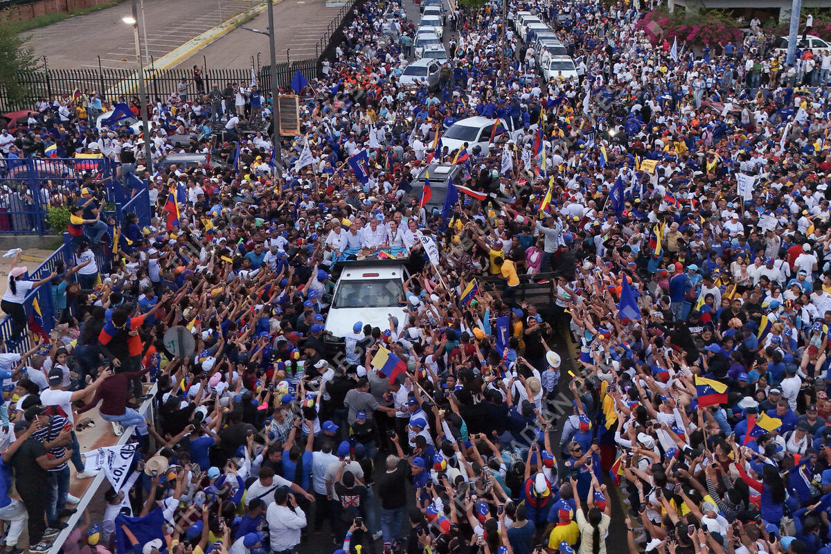 Presidential candidate Edmundo Gonzalez, center, and opposition leader Maria Corina Machado, center right, greet supporters during a campaign rally in Maracaibo, Venezuela, Tuesday, July 23, 2024. The presidential election is set for July 28. (AP Photo/Matias Delacroix)