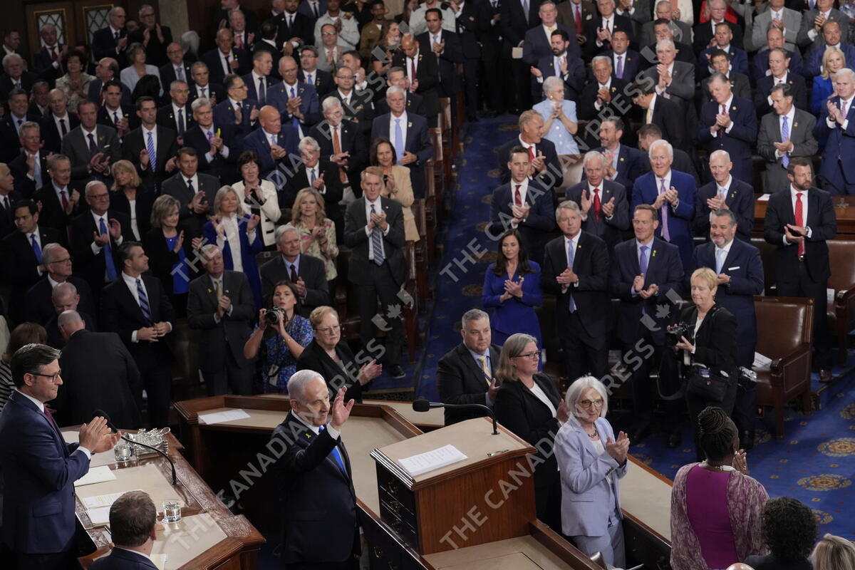 Israeli Prime Minister Benjamin Netanyahu waves as he arrives to speak to a joint meeting of Congress to seek support for Israel's fight against Hamas and other adversaries, at the Capitol in Washington, Wednesday, July 24, 2024. He is joined on the dais by Speaker of the House Mike Johnson, R-La., and Senate Foreign Relations Chair Ben Cardin, D-Md. (AP Photo/J. Scott Applewhite)