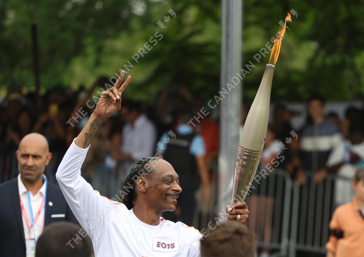 Snoop Dogg carries the Olympic torch at the 2024 Summer Olympics, Friday, July 26, 2024, in Saint-Denis, outside Paris, France. (AP Photo/Aurelien Morissard)
