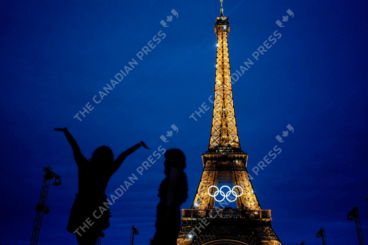 The United States' Amarilees Bolorin, left, takes a selfie with a friend in front of the Eiffel Tower ahead of the 2024 Summer Olympics, Thursday, July 25, 2024, in Paris, France. (AP Photo/Natacha Pisarenko)