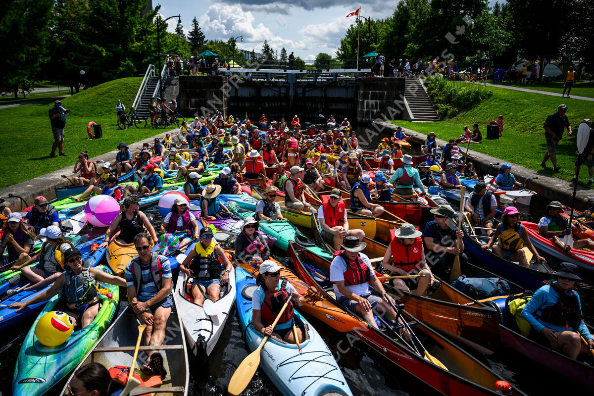 Paddlers wait to descend the locks at Hartwells Lockstation during Lock & Paddle 2024 on the Rideau Canal in Ottawa, on Saturday, July 20, 2024. A flotilla of canoes and kayaks descended and ascended the locks to celebrate Parks Day on the Rideau Canal, a UNESCO World Heritage site. THE CANADIAN PRESS/Justin Tang