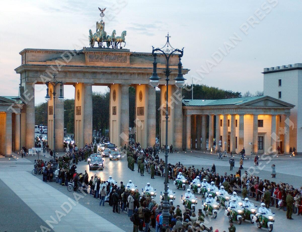 FILE - A Tuesday, Nov. 2, 2004 photo from files of Britain's Queen Elizabeth II and Prince Philip being escorted by the police as they drive through the Brandenbourg gate in Berlin, during a three-day state visit. Queen Elizabeth II is planning to leave Tuesday, June 23, 2015, on a state visit to Germany that will include her first visit to a former concentration camp site. She and her husband Prince Philip plan to visit the Bergen-Belsen camp where diarist Anne Frank and her sister Margot died just weeks before the British liberated it on April 15, 1945. (Stephanie Pilick/File Pool Photo via AP)