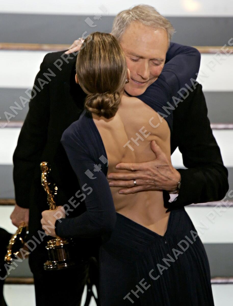 Director Clint Eastwood is congratulated by his film's star Hilary Swank before accepting the Oscar for best director for his work on "Million Dollar Baby" at the 77th Academy Awards Sunday, Feb. 27, 2005, in Los Angeles. (AP Photo/Mark J. Terrill)