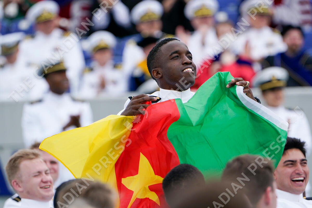 A midshipman from Cameroon is recognized by President Joe Biden during the U.S. Naval Academy's graduation and commissioning ceremony at the Navy-Marine Corps Memorial Stadium in Annapolis, Md., Friday, May 27, 2022. (AP Photo/Manuel Balce Ceneta)