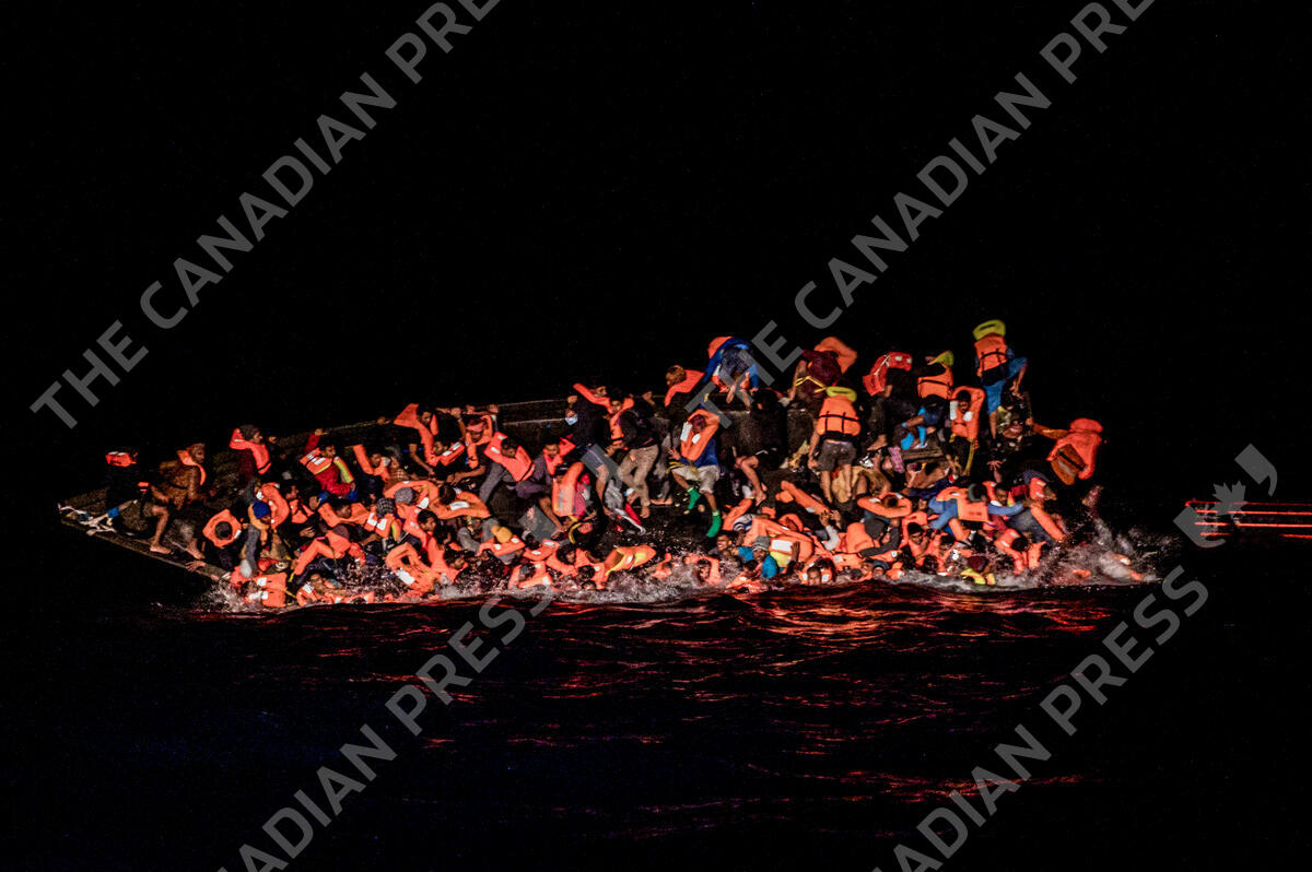 Dozens of migrants fall in the water while they struggle to cling to the side of an upturning boat off the waters of Tunisia, early Wednesday, May 25, 2022. Some 110 people were rescued by the non-governmental organization Open Arms during a mission in the Mediterranean Sea. (AP Photo/Valeria Ferraro)