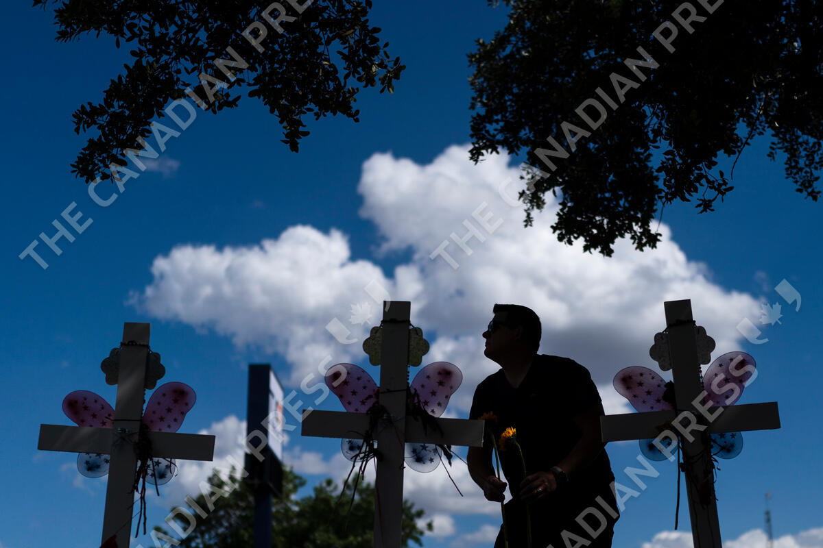 Matthew Solano leaves sunflowers at a memorial to honor the victims killed in last week's elementary school shooting in Uvalde, Texas, Wednesday, June 1, 2022. On May 24, 2022, an 18-year-old entered the school and fatally shot several children and teachers. (AP Photo/Jae C. Hong)