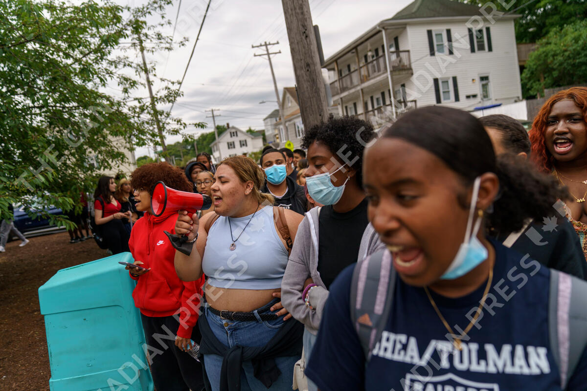 Students from Shea High School shout the names of those killed in last week's school shooting in Uvalde, Texas, as they pause during their walkout to protest the nation's gun policies, Wednesday, June 1, 2022, in Pawtucket, R.I. Organizer Zachary Pinto, 17, said his fellow students told them they were frustrated, angry and in pain after last week's school shooting. He led students to a rally at city hall where they were then joined by other local high school students. (AP Photo/David Goldman)