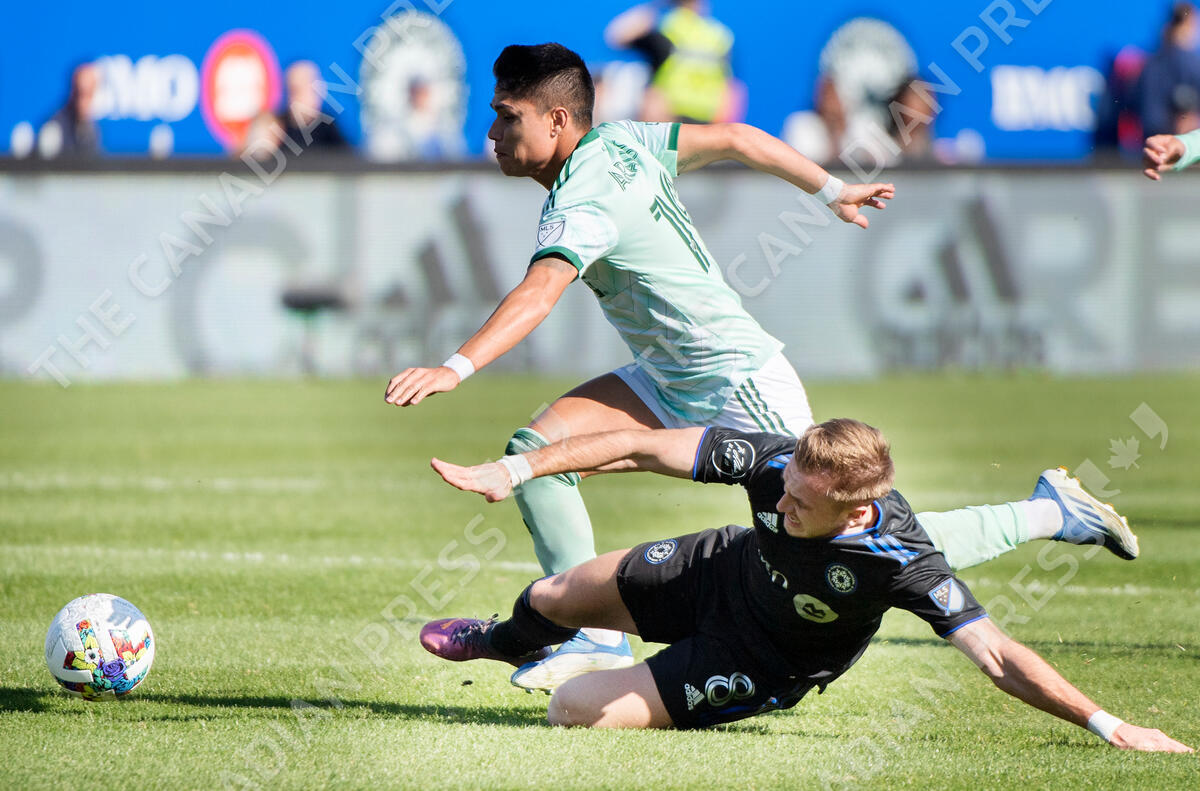CF Montreal's Djordje Mihailovic, right, challenges Atlanta United's Luiz De Araujo during first half MLS soccer action in Montreal, Saturday, April 30, 2022. THE CANADIAN PRESS/Graham Hughes