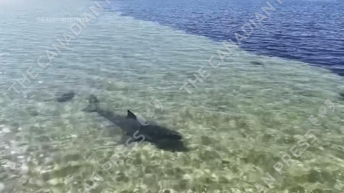Nash Core used his drone to shoot video of the writhing shark before he and and his son Parker decided to help the trio who were struggling to move the shark into deeper water.