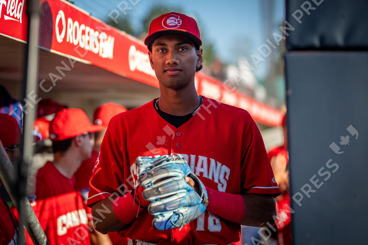 Vancouver Canadians shortstop Arjun Nimmala prepares to enter the field before a Northwest Minor League Baseball against the Eugene Emeralds in Vancouver on Wednesday, July 23, 2025. THE CANADIAN PRESS/Ethan Cairns