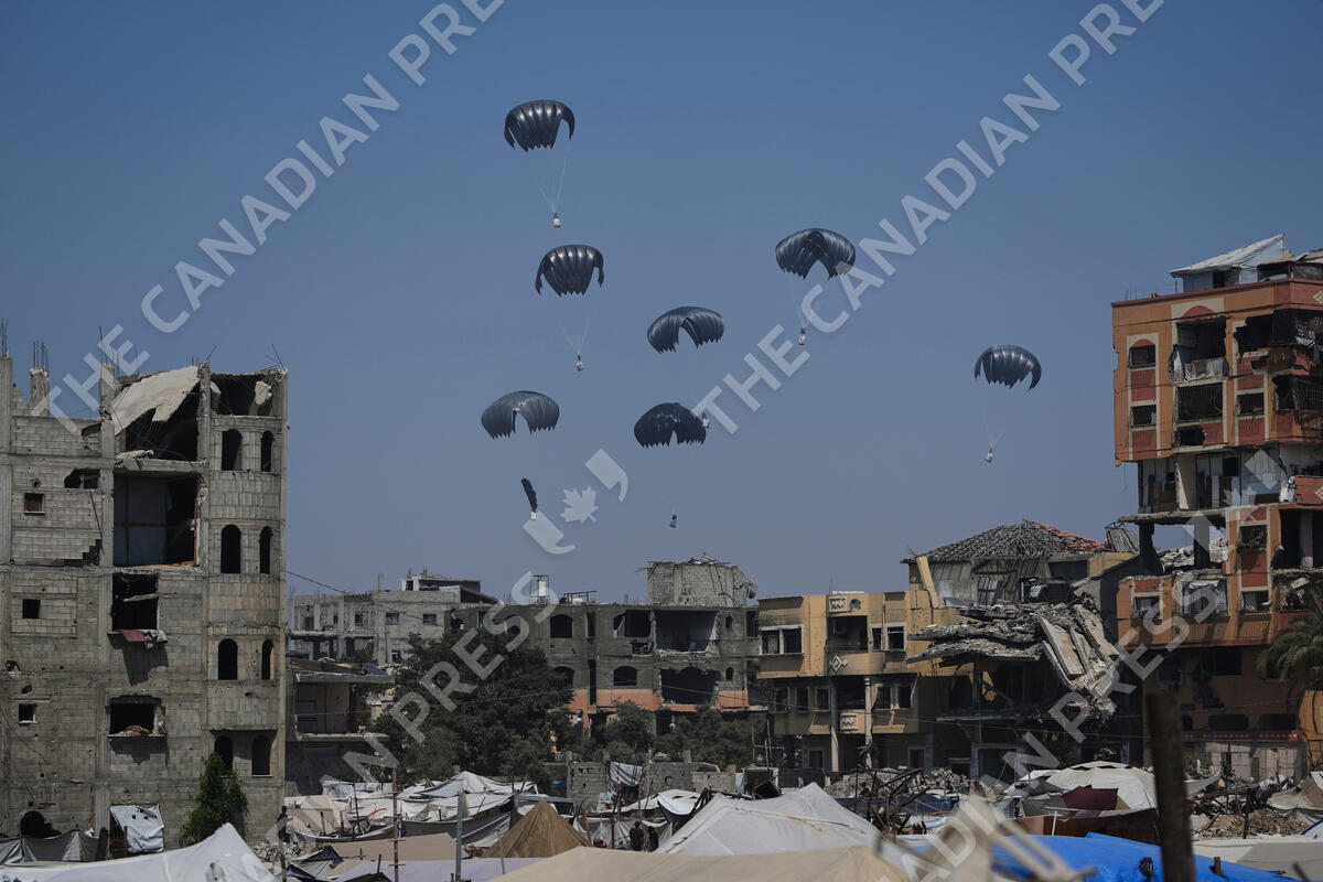Humanitarian aid is airdropped to Palestinians over northern Gaza Strip, Sunday, July 27, 2025. (AP Photo/Abdel Kareem Hana)