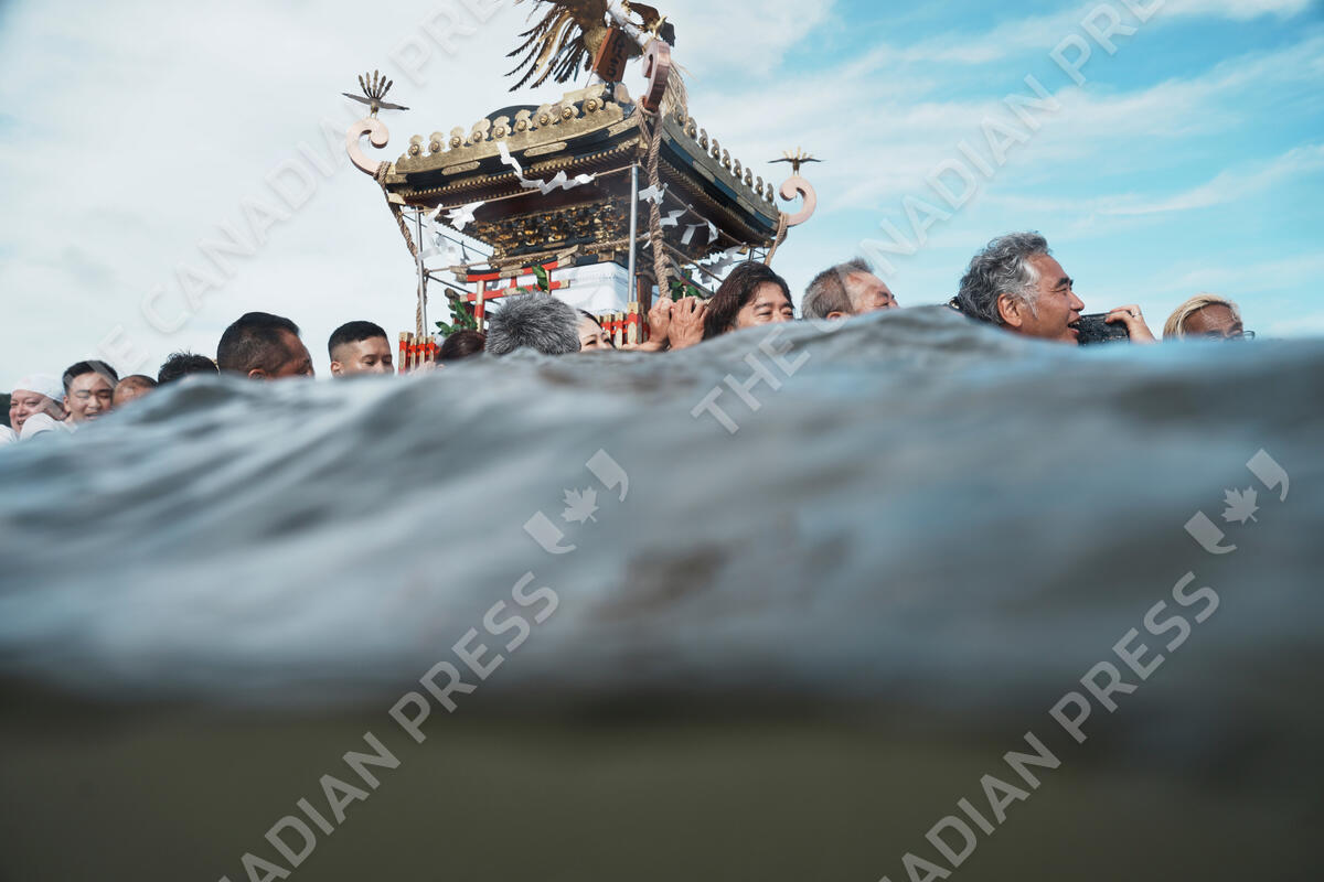Participants carry a portable shrine, or mikoshi, into the sea during a purification rite at the annual Kurihama Sumiyoshi Shrine Festival at Kurihama, Yokosuka city, south of Tokyo Sunday, July 27, 2025. (AP Photo/Eugene Hoshiko)