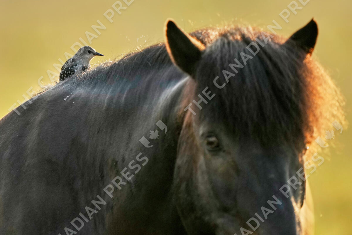 A starling sits on an Icelandic horse at a stud farm in Wehrheim near Frankfurt, Germany, Tuesday, July 29, 2025. (AP Photo/Michael Probst)