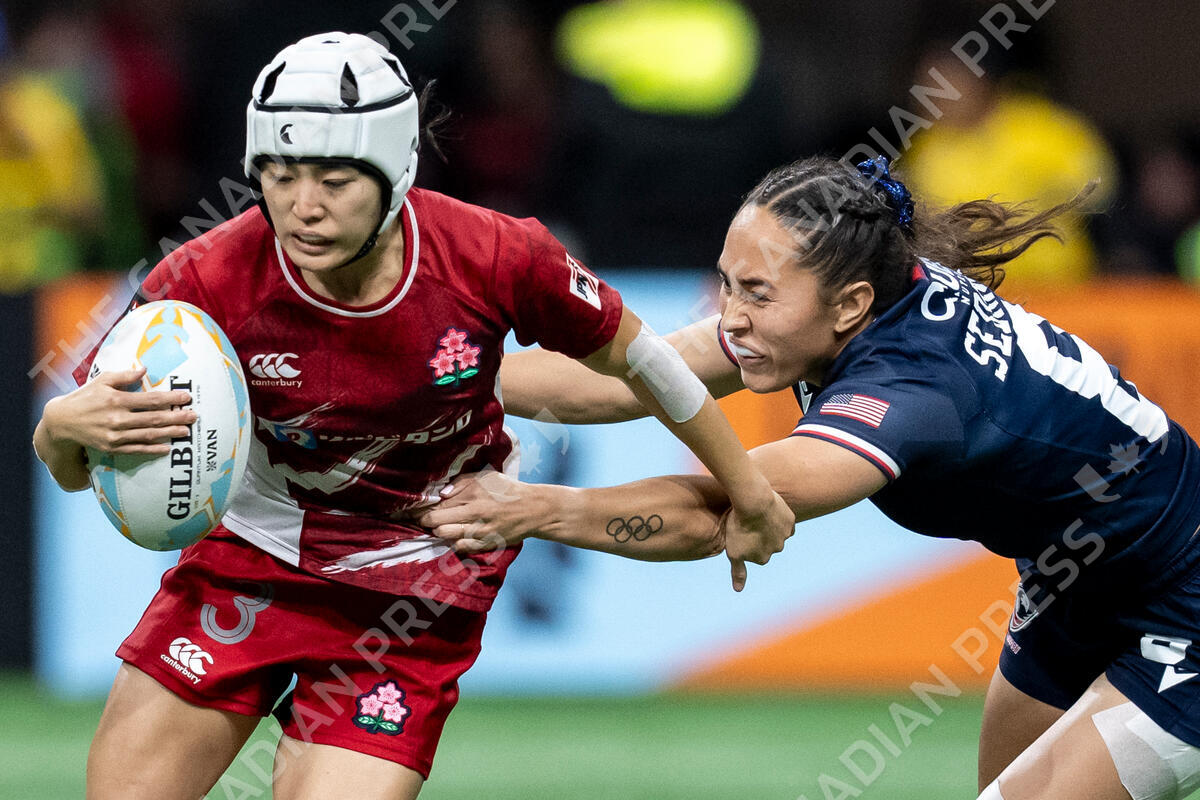 Japan's Honoka Tsutsumi, left, runs the ball as United States' Alex Sedrick tries to stop her during Vancouver Sevens quarter final women's rugby action, in Vancouver, B.C., Saturday, Feb. 22, 2025. THE CANADIAN PRESS/Ethan Cairns