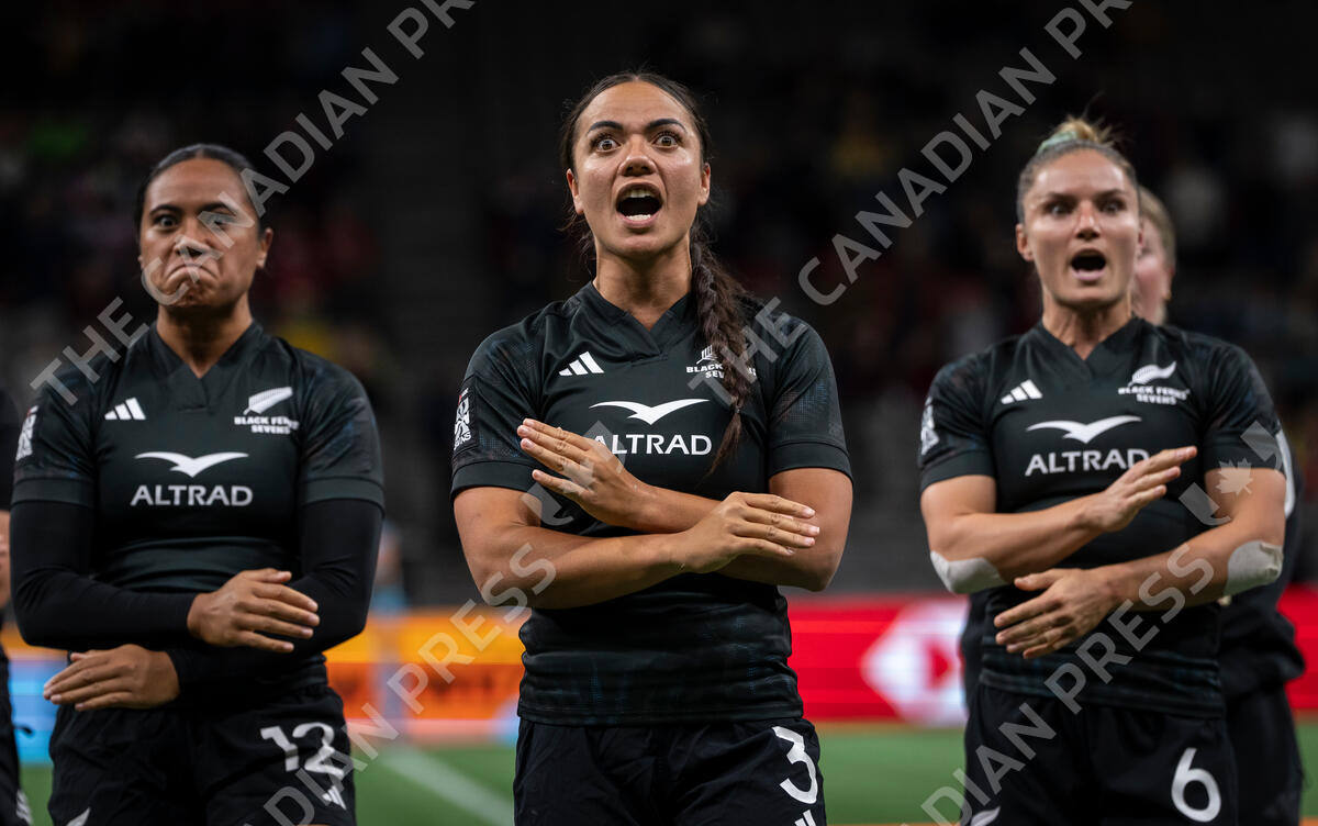 New Zealand's Stacey Waaka performs a Haka after defeating Fiji to win gold during Vancouver Rugby Sevens, in Vancouver, B.C., Sunday, Feb. 23, 2025. THE CANADIAN PRESS/Ethan Cairns