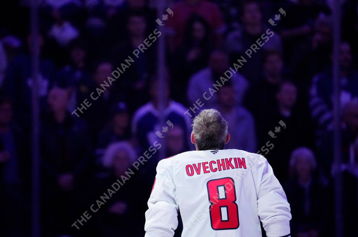 Washington Capitals' Alex Ovechkin (8) stands for the national anthems prior to NHL hockey action against the Toronto Maple Leafs in Toronto on Saturday, Dec. 28, 2024. THE CANADIAN PRESS/Frank Gunn