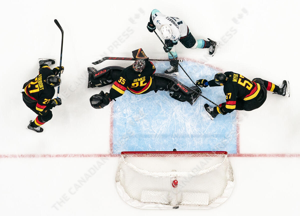 Seattle Kraken's Jaden Schwartz (17) scores on Vancouver Canucks goaltender Thatcher Demko (35) as Derek Forbort (27) and Tyler Myers (57) defend during the third period of an NHL hockey game in Vancouver, on Saturday, December 28, 2024. THE CANADIAN PRESS/Ethan Cairns