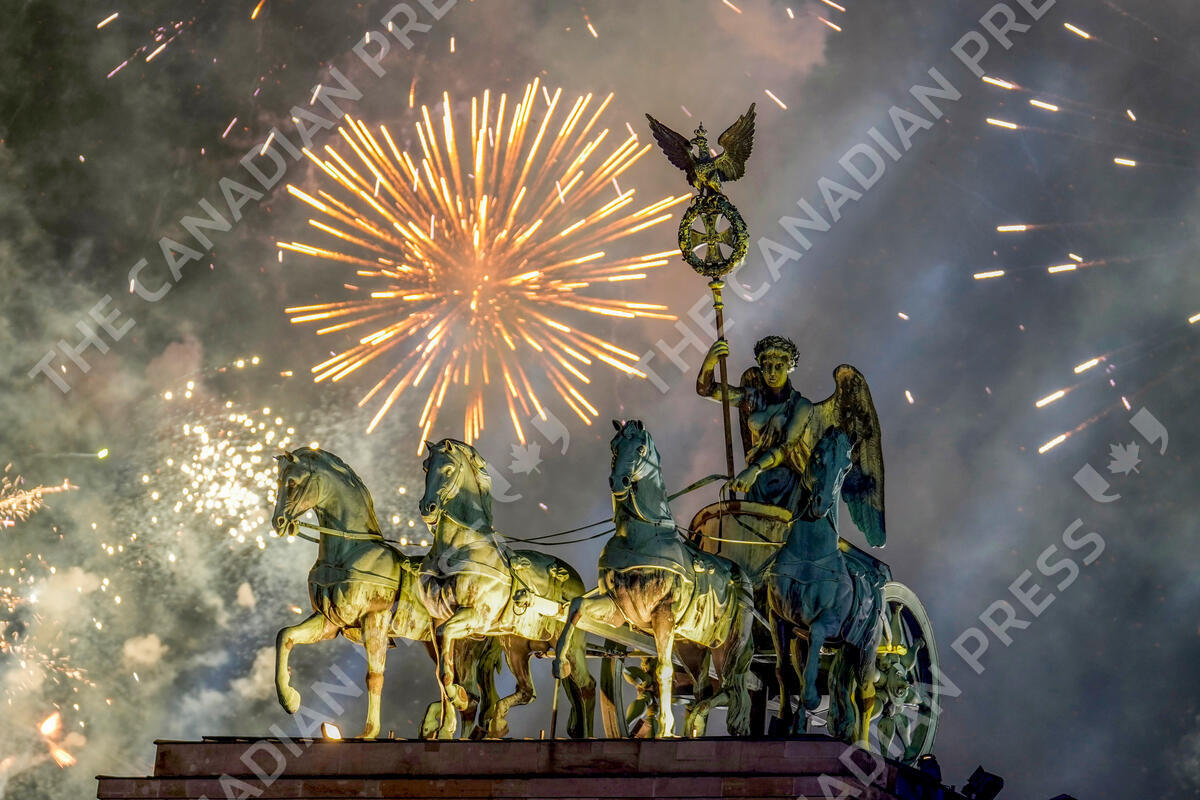 Fireworks light the sky above the Quadriga at the Brandenburg Gate during New Year's celebrations shortly after midnight in Berlin, Germany, Wednesday, Jan. 1, 2025. (AP Photo/Ebrahim Noroozi)